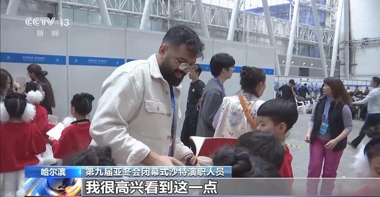在闭幕式的演员候场区,记者看到,有不少来自沙特阿拉伯的演职人员正在和参加第九届亚冬会闭幕式排练演出的“小朋友们”互道祝福、签名、合影留念。沙特的演职人员热情地为小朋友写下祝福,现场洋溢着友好的氛围。