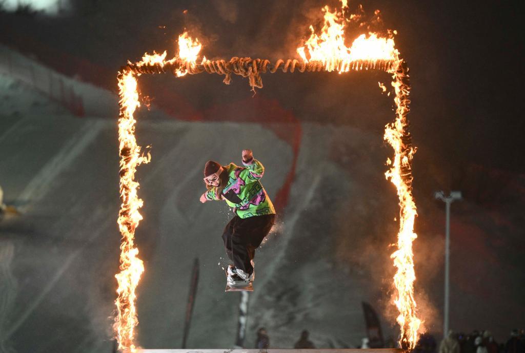 1月29日,雪友在新疆将军山国际滑雪度假区新春趣味滑雪公园跳台活动上钻过火圈。新华社记者胡虎虎 摄