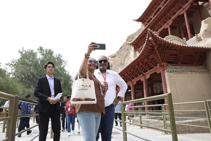 2024年6月7日,前来甘肃调研考察的驻华外交官在敦煌莫高窟九层楼前留影。新华社记者 陈斌 摄