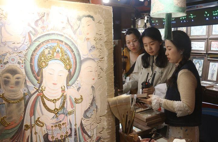 街道上,独具特色的文化元素无处不在。民宿老板用改良的“三兔共耳”纹样装饰门楣,茶馆的八棱柱竟是莫高窟中心塔柱的微缩版。最多的还是书店和文创店,一家挨着一家,红柳根雕、敦煌乐器、创意工美、飞天泥版画琳琅满目。