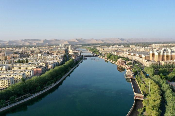 乘飞机从甘肃省会兰州往西飞行约两个小时后,茫茫戈壁上一个绿色小点出现在视线里。随着飞机高度下降,俯瞰下去,一片多边形的绿洲逐渐显现,如一块美丽宝石。