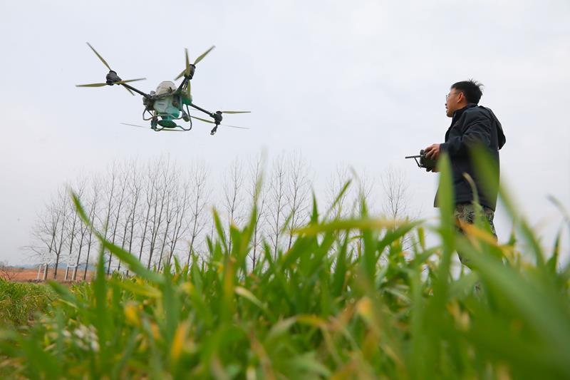 △2025年2月14日,在浙江杭州市临安区天目山镇“天目粮仓”粮食功能区,农机人员遥控植保无人机给小麦施肥。