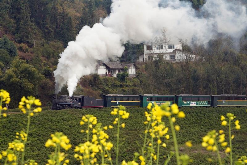 △2025年2月14日,四川乐山市犍为县菜子坝景点试种的早季油菜花进入盛开期,蒸汽小火车穿越油菜花海,吸引不少游客前来观看。