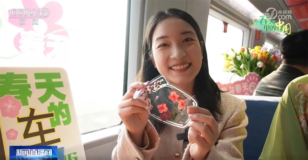 G7715次列车从杭州出发,会途经绍兴、台州等多个热门的赏花城市,而且在沿线有成片的花海,也会成为装点车窗的风景。在这趟列车上,我们还可以收获多样的赏花体验。比如说像现在,乘务员就换上了国风的服饰,拿上了花篓与乘客对诗,而成功的乘客就可以收获一支鲜花。