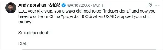 “笑死,你们人设崩了。”在中国生活和工作多年的新西兰媒体人安迪·博勒姆(中文名安柏然)也嘲讽道,“成天标榜自己‘独立’,现在美国国际开发署断了黑钱,对华‘项目’得100%砍光。还真是独立啊!赶紧凉透吧!”