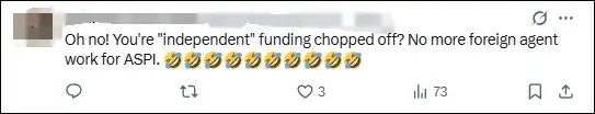 “哦豁!‘独立智库’的资金被切断啦?ASPI这下做不成外国代理人的勾当咯。”