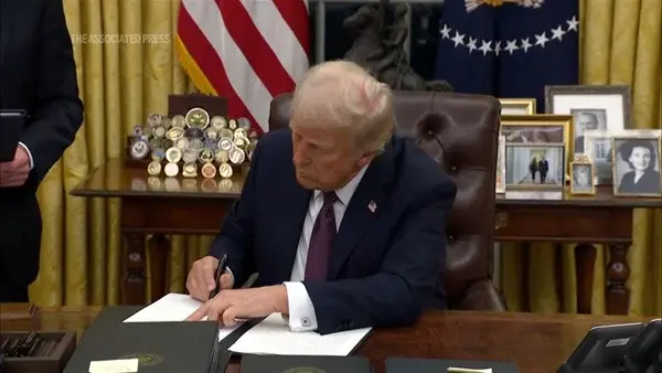 当地时间1月20日,特朗普签署行政命令,要求暂停美国所有对外援助计划。 美联社视频截图