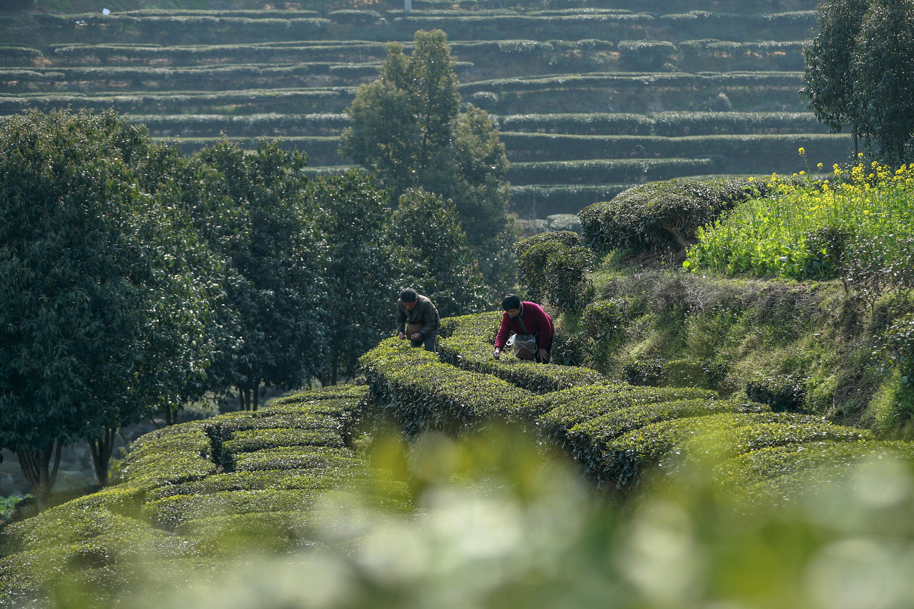 3月10日,湖北省宜昌市秭归县茅坪镇金缸城村村民在茶园采摘茶叶嫩芽。