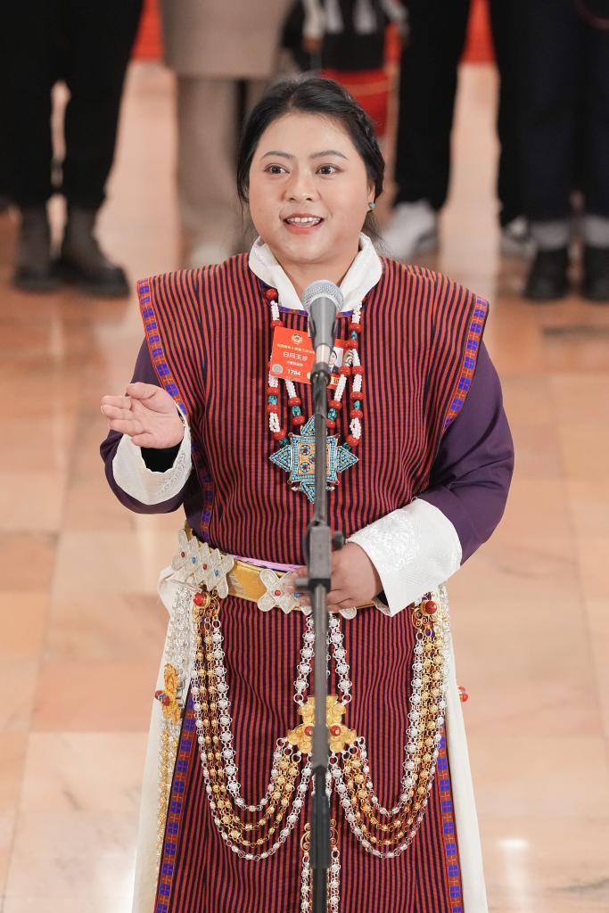 3月10日,全国政协十四届三次会议第三场“委员通道”集体采访活动在北京人民大会堂举行。这是全国政协委员白玛玉珍接受媒体采访。新华社记者 才扬 摄