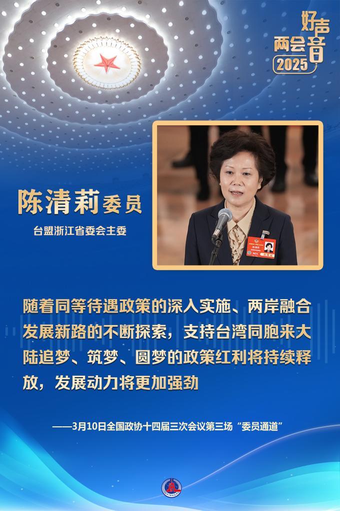 台盟浙江省委会主委陈清莉委员分享了台湾同胞在浙江生活、创业的故事。她表示,随着同等待遇政策的深入实施、两岸融合发展新路的不断探索,支持台湾同胞来大陆追梦、筑梦、圆梦的政策红利将持续释放,发展动力将更加强劲。