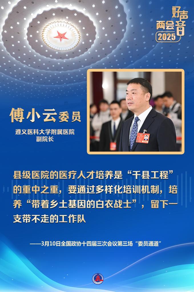 “国家持续实施‘千县工程’,开展医疗人才‘组团式’支援帮扶,支援西藏、新疆、青海等地区医院和国家乡村振兴重点帮扶县人民医院。”遵义医科大学附属医院副院长傅小云委员说。