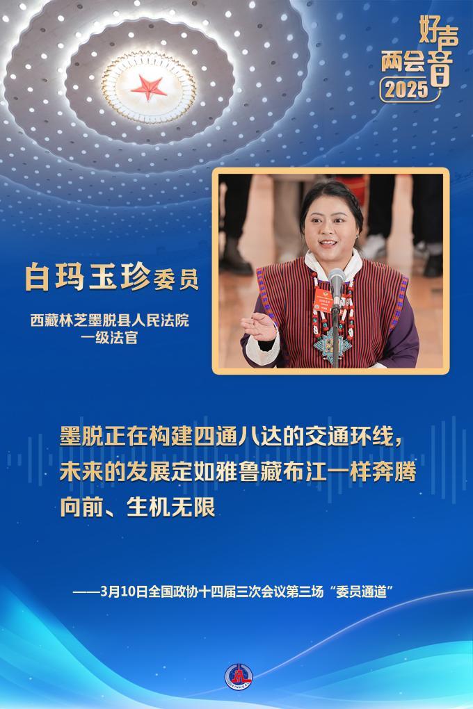 白玛玉珍委员来自全国最后一个通公路的县——西藏墨脱。她说,墨脱实现了从“高原孤岛”向“美丽边城”的时代蜕变,家家户户用上了干净水、稳定电、高速网,老百姓吃上了“生态旅游饭”,增收的路子越来越宽。