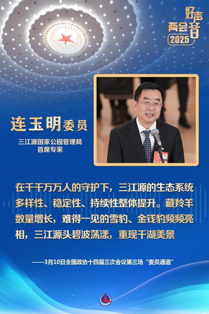 第一位回答记者提问的三江源国家公园管理局首席专家连玉明委员,是一名援青干部。他告诉大家,在三江源国家公园,有21432名生态管护员。在千千万万人的守护下,三江源的生态系统多样性、稳定性、持续性整体提升。藏羚羊数量增长,难得一见的雪豹、金钱豹频频亮相,三江源头碧波荡漾,重现千湖美景。