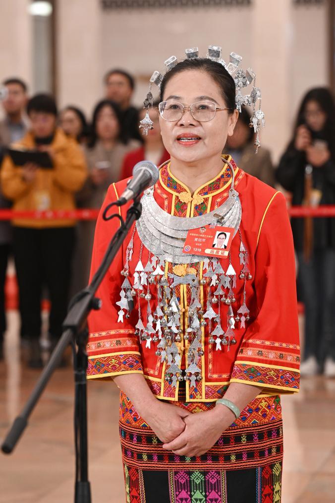 3月10日,全国政协十四届三次会议第三场“委员通道”集体采访活动在北京人民大会堂举行。这是全国政协委员黄丽萍接受媒体采访。新华社记者 金良快 摄