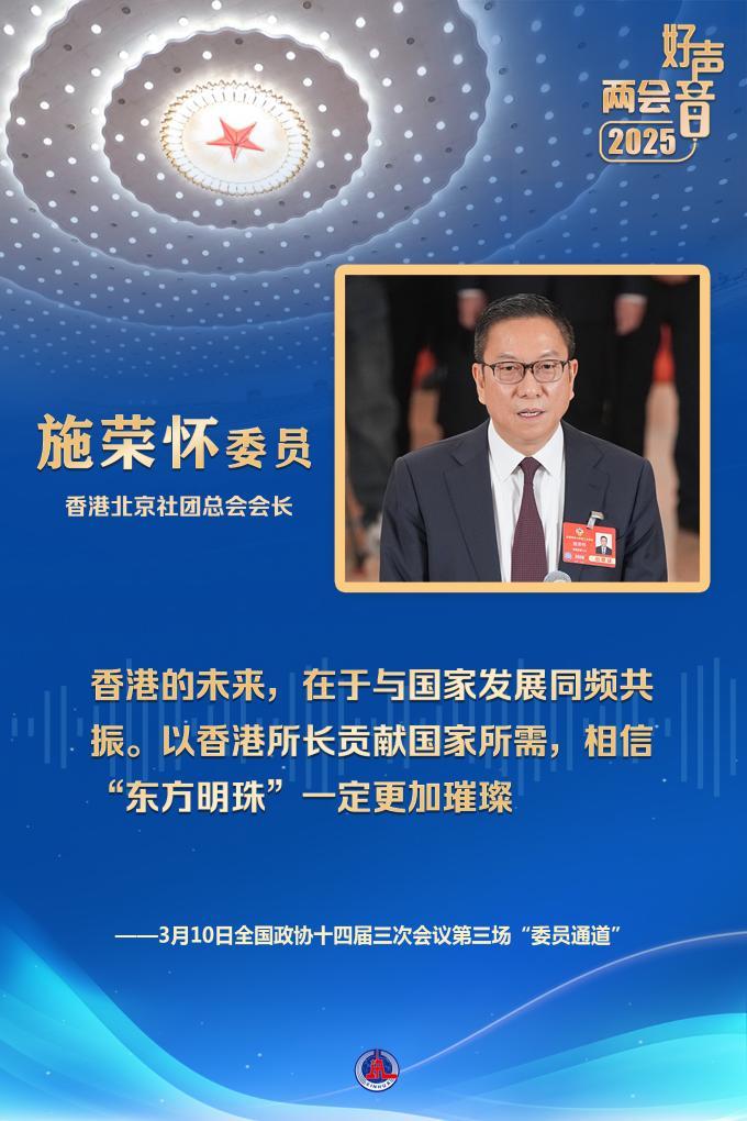 香港北京社团总会会长施荣怀委员体会到,随着港珠澳大桥开通,香港更好融入大湾区互联互通发展。他说,香港的未来,在于与国家发展同频共振。以香港所长贡献国家所需,相信“东方明珠”一定更加璀璨。