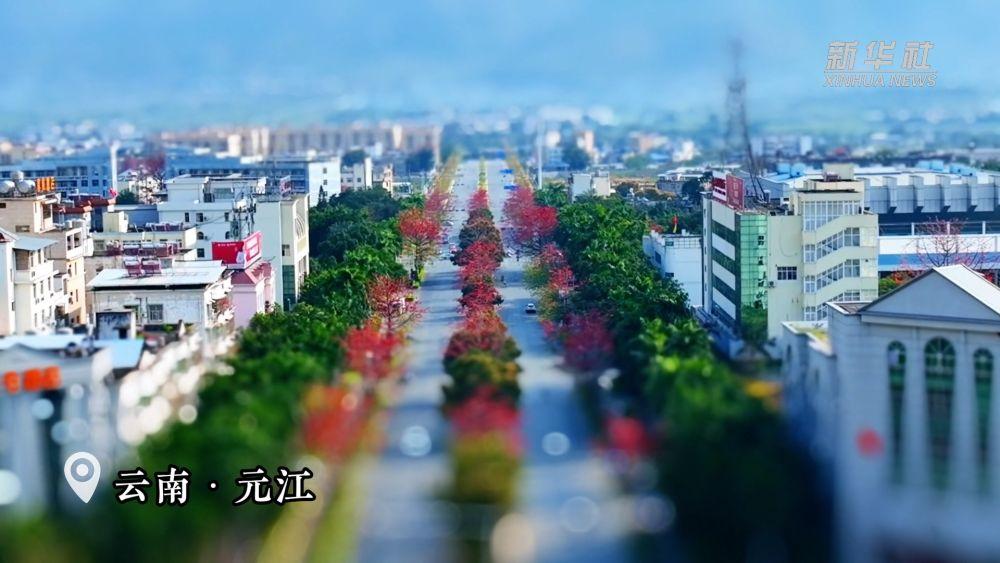 元江攀枝花正值盛花期,火红的花朵缀满枝头,如一团团燃烧的火苗。