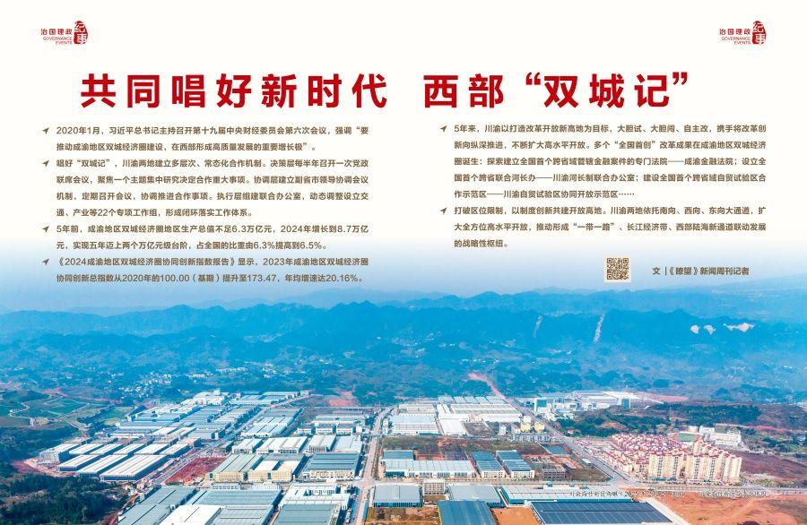 2024年4月,习近平总书记在重庆考察时指出,建设成渝地区双城经济圈是党中央作出的重大战略决策。重庆、四川两地要紧密合作,不断提升发展能级,共同唱好新时代西部“双城记”。