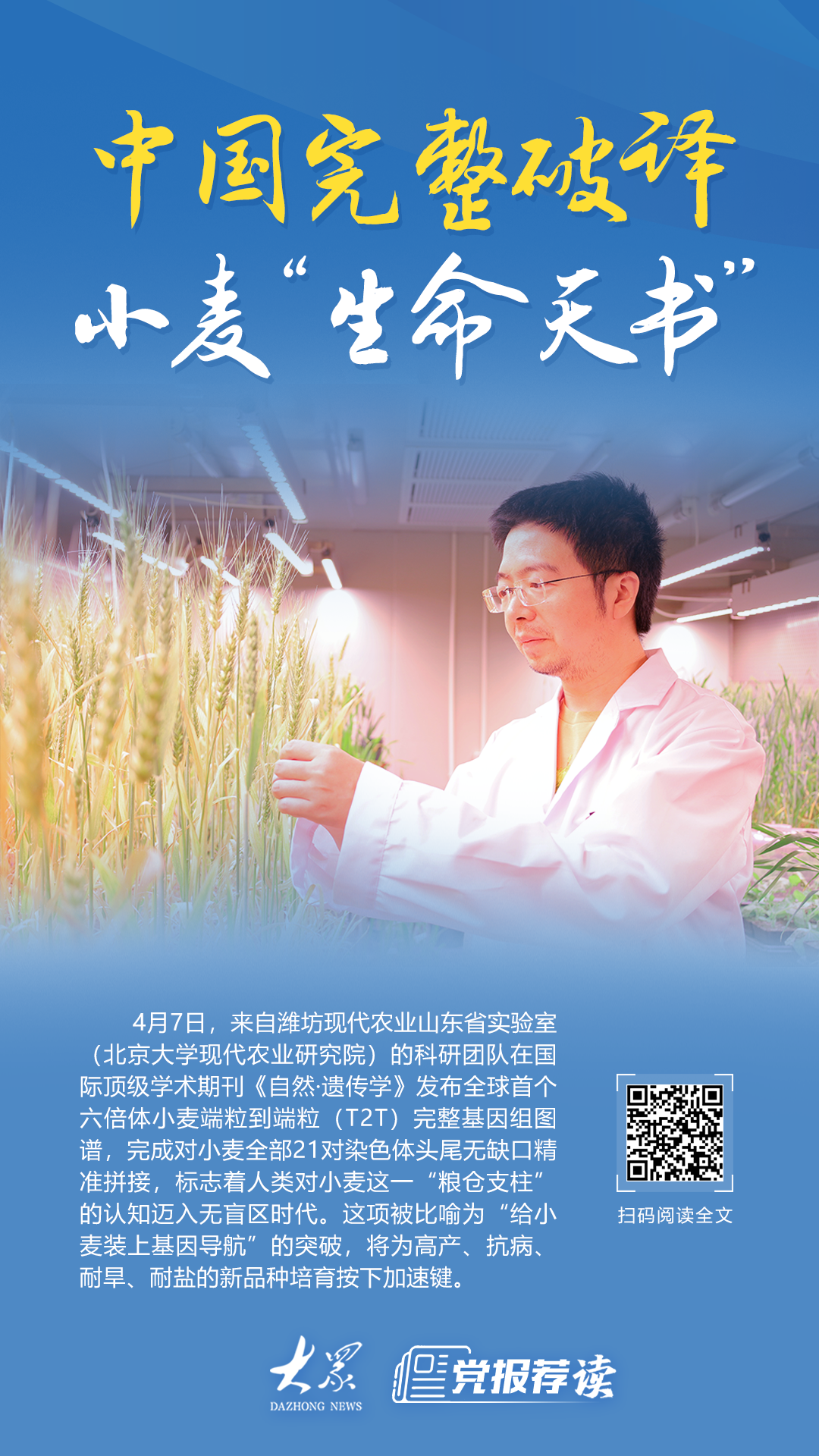 “过去我们只能通过零碎的基因组片段推测小麦的生命逻辑,现在终于有了完整清晰的图谱。”潍坊现代农业山东省实验室(北京大学现代农业研究院)主任邓兴旺说。