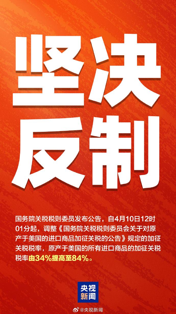 自北京时间4月10日12时01分起,中国对原产于美国的所有进口商品加征84%关税,以反制美方不断升级的关税霸凌。其他的反制措施包括:在世贸组织争端解决机制下追加起诉、将多家美国实体列入不可靠实体清单等。此外,中方发布了近3万字《关于中美经贸关系若干问题的中方立场》白皮书,系统阐释了自身原则、政策与立场。国际媒体认为,“中国有理有据反击美关税霸凌”。彭博社称,“任何认为世界第二大经济体会简单地接受打击或急于安抚白宫的期望,都是痴心妄想”。