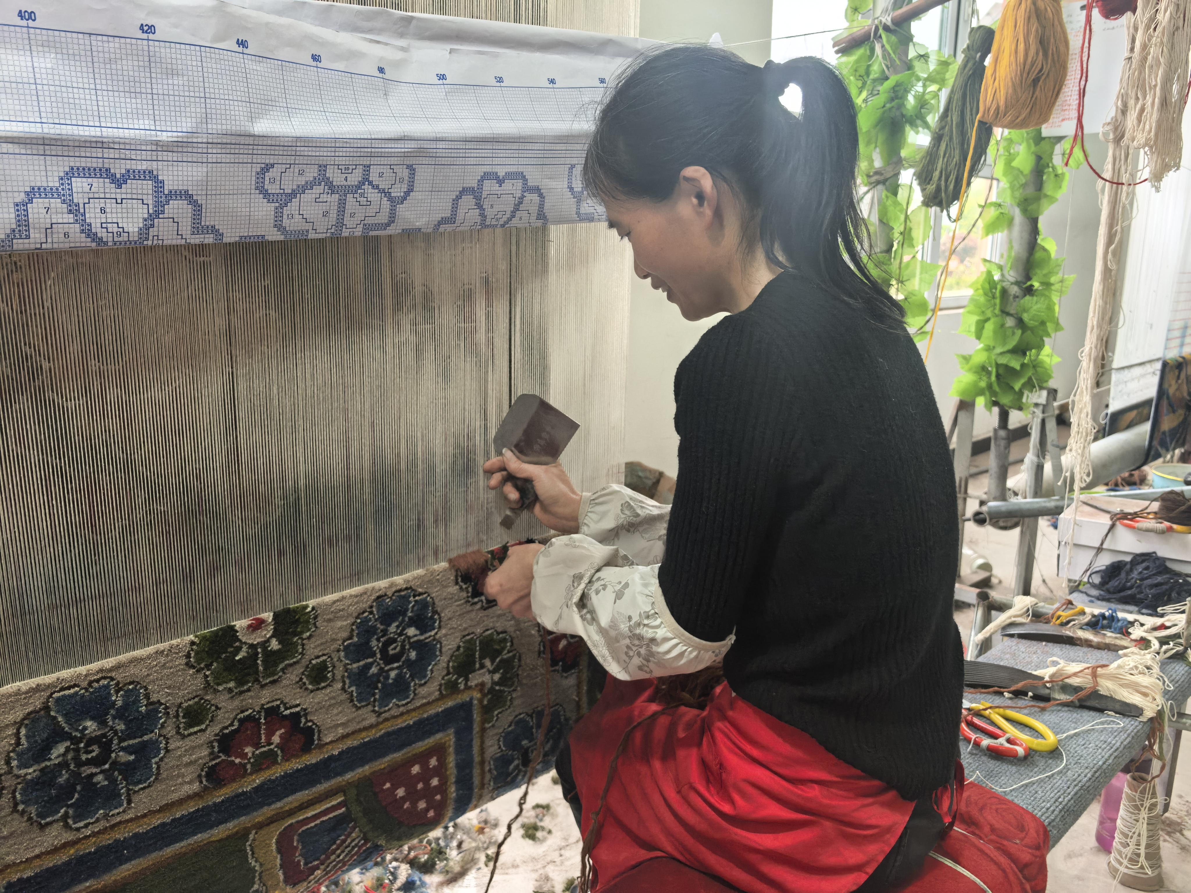 4月11日,在菏泽市鄄城县六合新村一家专门从事高级手工编织地毯、挂毯的工坊里,十几位编织手艺人熟练地编针着,在经纬交织、毛线缠绕间,一块块图案精美的地毯或挂毯在他们手中逐渐成型。