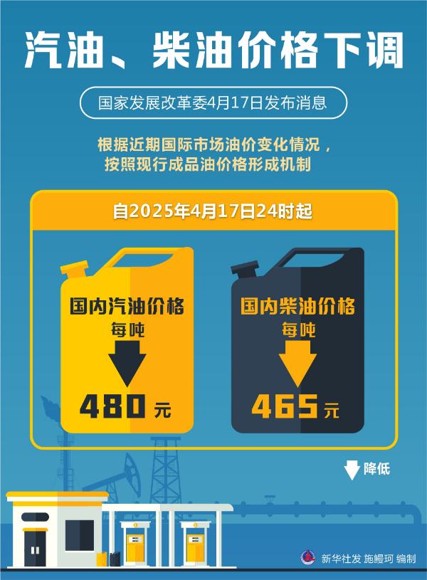新华社北京4月17日电(魏玉坤、李沛原)国家发展改革委17日发布消息,根据近期国际市场油价变化情况,按照现行成品油价格形成机制,自2025年4月17日24时起,国内汽、柴油价格每吨分别降低480元和465元。