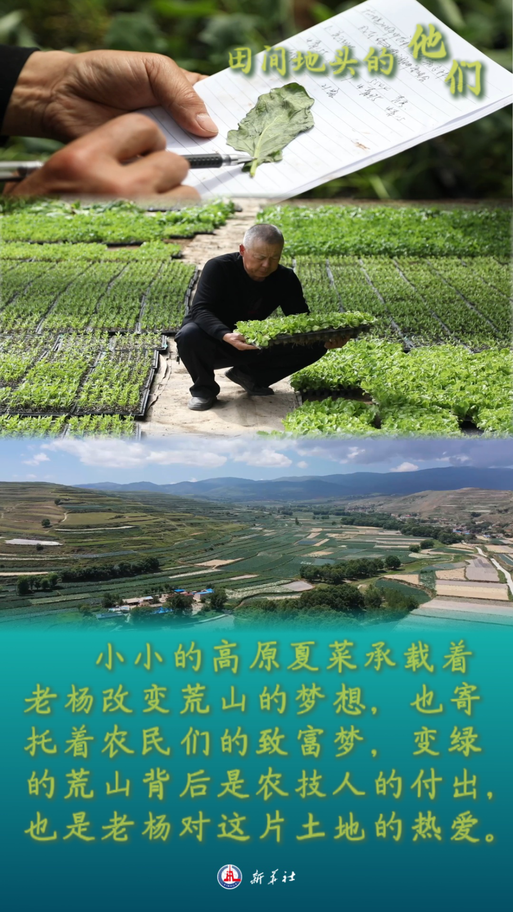 为了让这山变绿,他做了很多试验,冬小麦、玉米,各种各样的农作物都尝试了,终于有一天,他拿起了一把高原夏菜的种子,拿起了给荒山刷绿的“第一桶漆”。