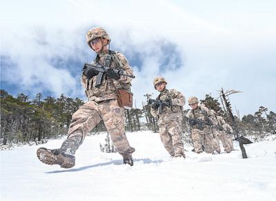 “墨脱戍边模范营”戍边官兵踏雪巡逻。