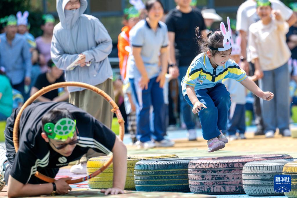 4月30日,在浙江省湖州市长兴县张家村花园幼儿园,家长与孩子一起参与“龟兔赛跑”亲子运动。