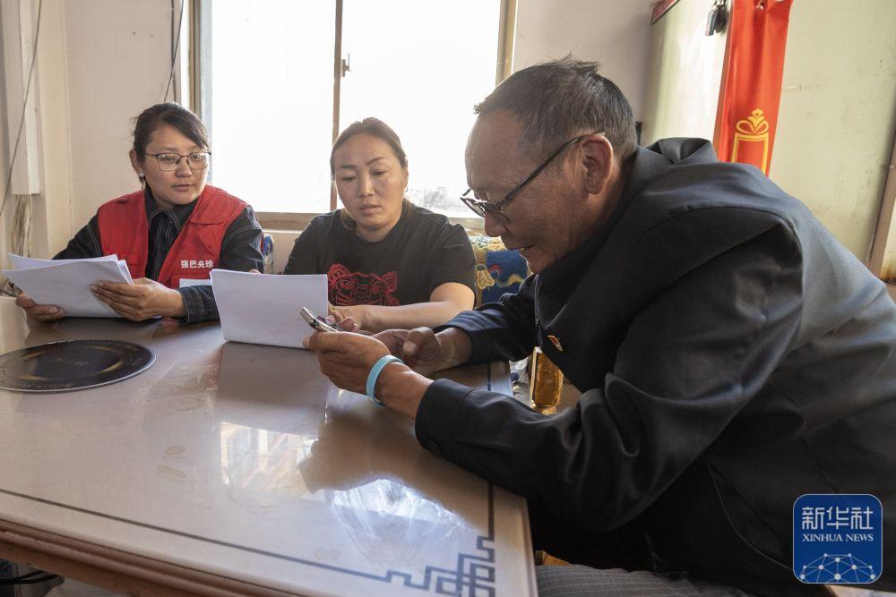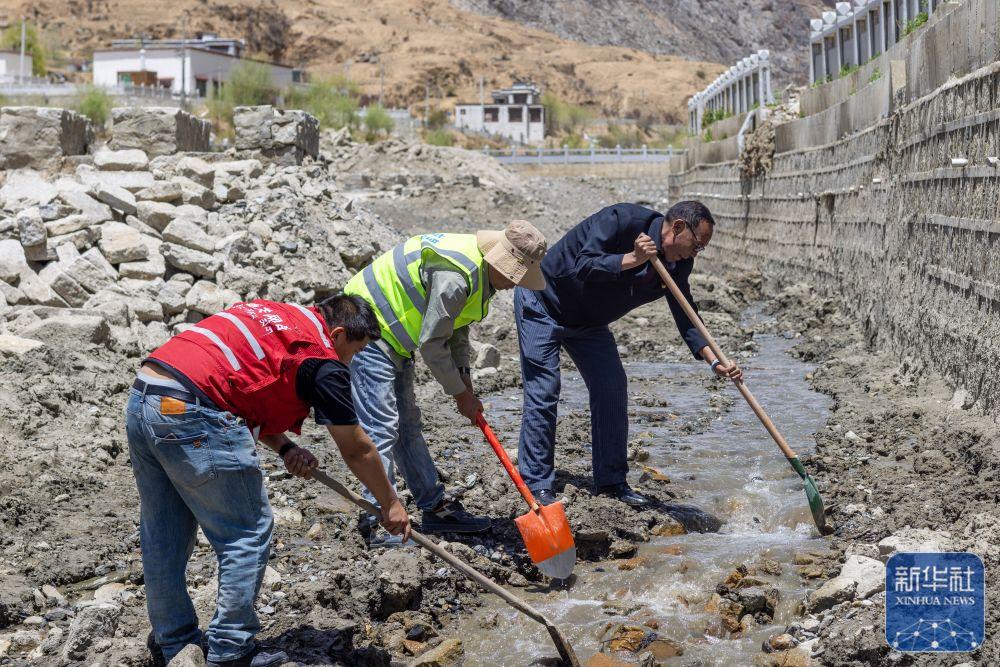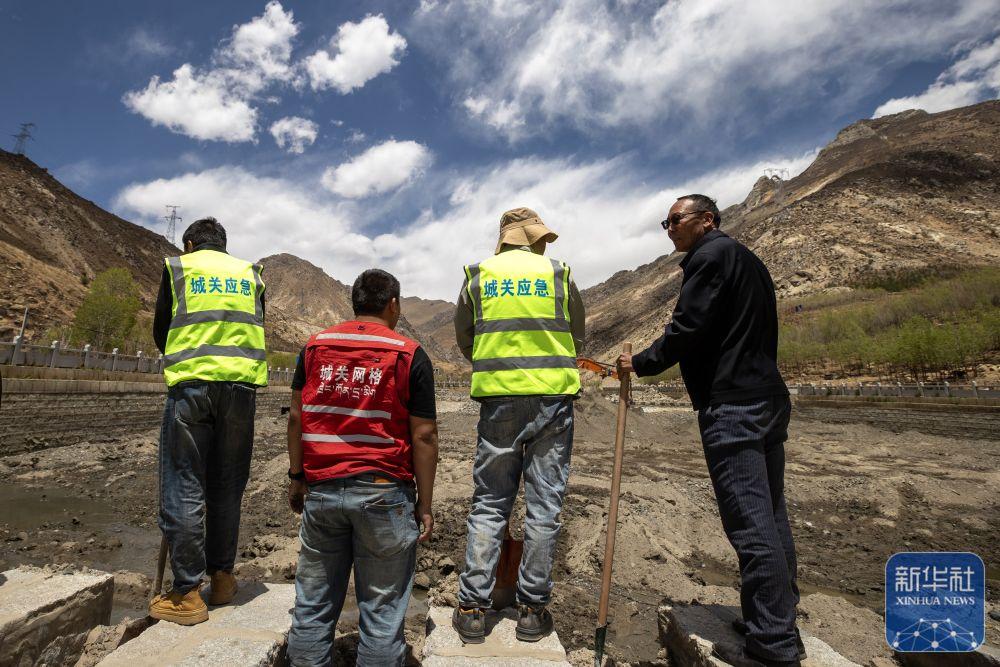 ↑ 尼玛(右一)与防汛工作人员一起巡查村中水道(4月24日摄)。