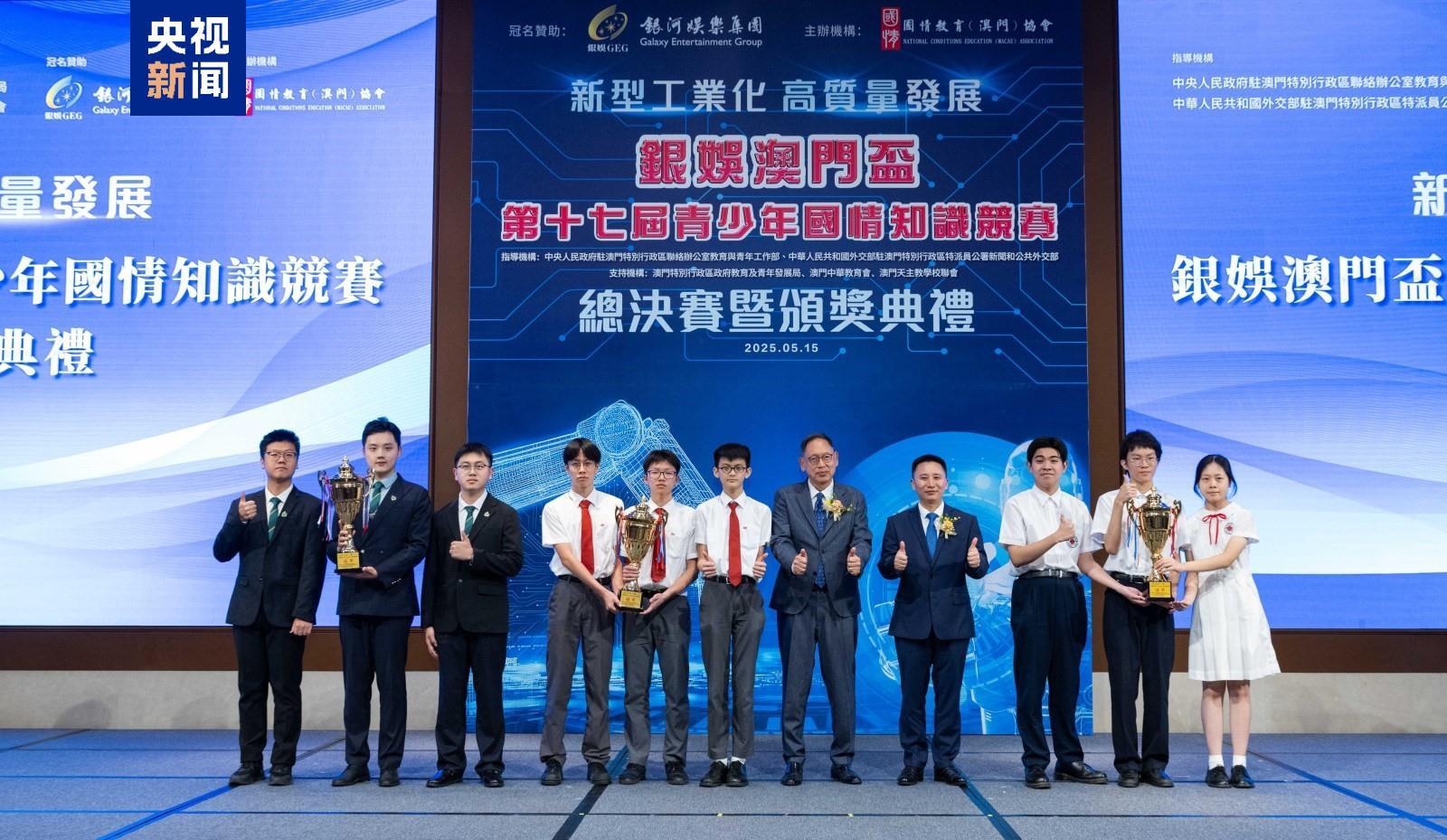 澳门第十七届青少年国情知识竞赛总决赛暨颁奖典礼15日举行。本届赛事共吸引了澳门26所中学和8所高等院校逾15000名学生踊跃参与,规模再创新高。培道中学、镜平学校和澳门理工大学分别夺得两个中学组和一个大学组冠军。