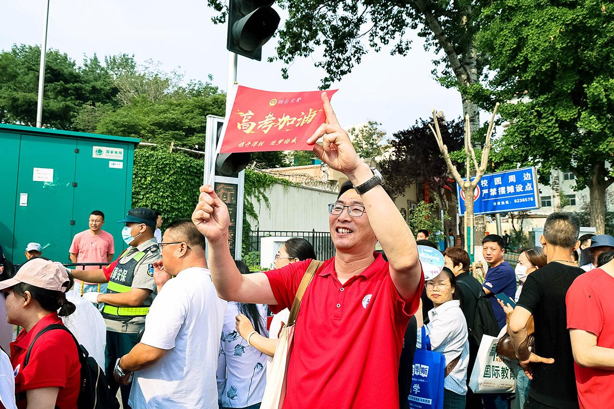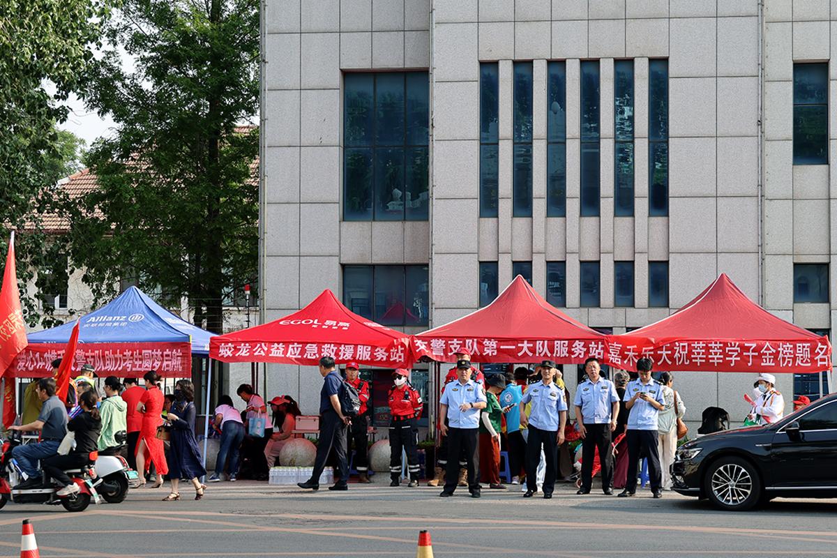 校门口交警、志愿者、公益组织等为考生保驾护航