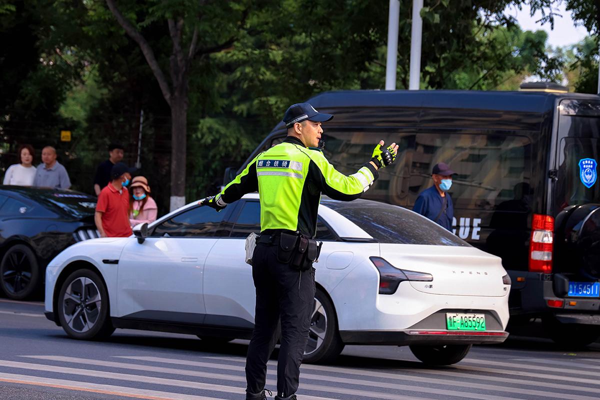 考场外交警在路口引导送考车辆