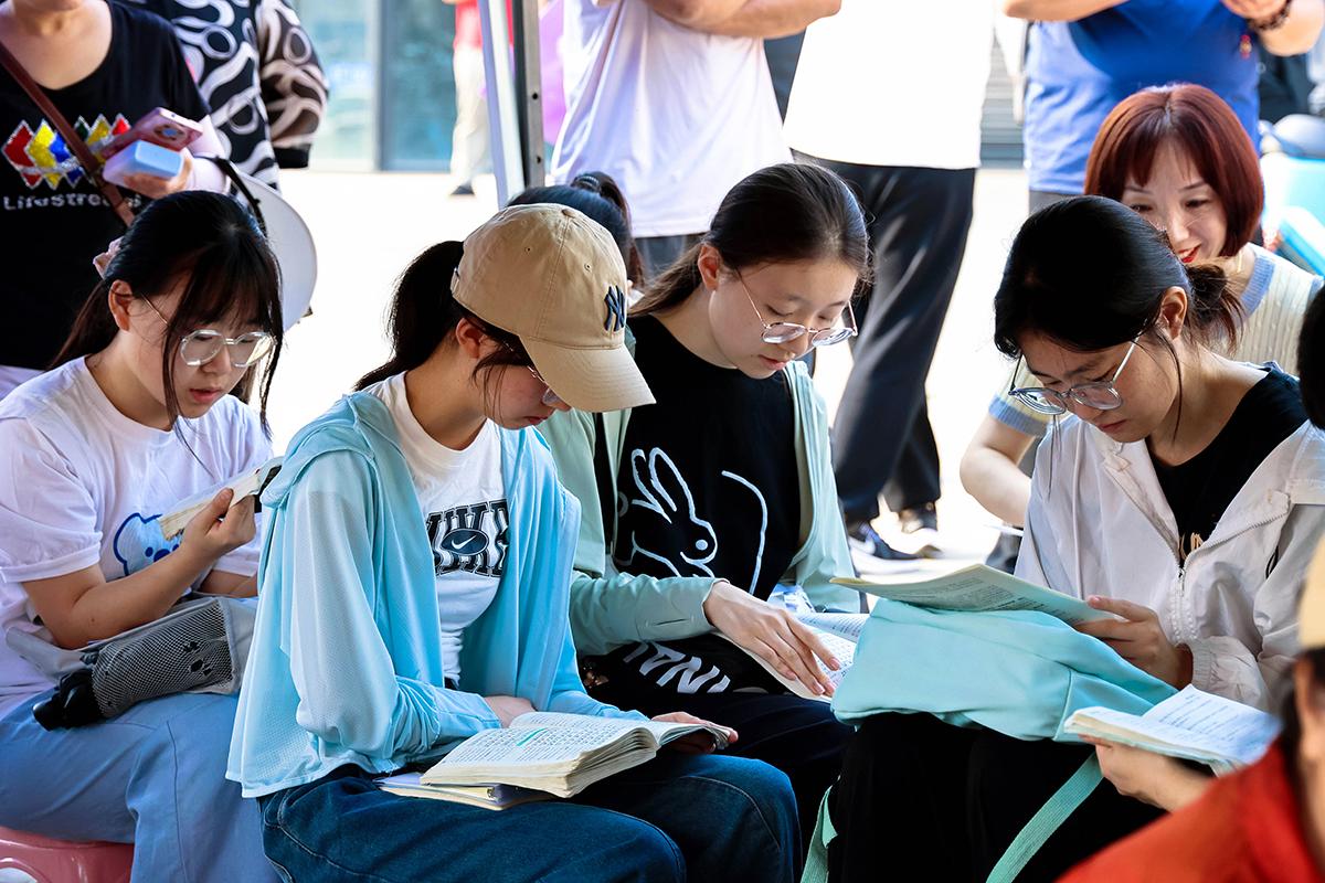 进入考场前,考生在校外做最后的复习