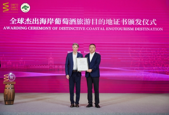 全球葡萄酒旅游组织(GWTO)主席何塞·安东尼奥·维达尔授予蓬莱产区“全球杰出海岸葡萄酒旅游目的地”证书。蓬莱区委常委、宣传部部长、区政府副区长冷启臣代表蓬莱产区接受证书颁发。