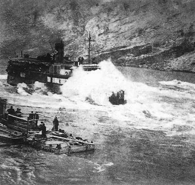 民生公司的船只经过激流险滩,将战略物资运送到后方。