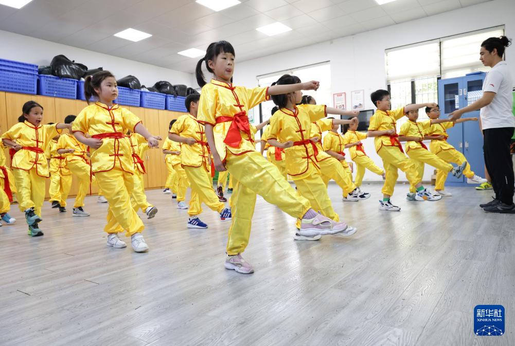 7月7日,小学员们在上海黄浦区老西门街道的爱心暑托班练习少年连环拳。