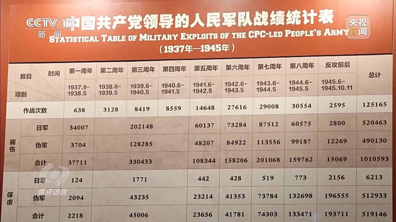 在展览现场,记者还看到这样两个统计表。从1937年9月到1945年10月11日,中国共产党领导的人民军队,一共作战次数是125165次,钳制和歼灭日军大量兵力,歼灭大部分伪军,敌后战场逐渐成为中国人民抗日战争的主战场。
