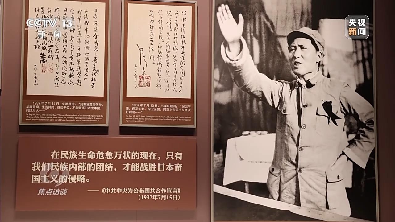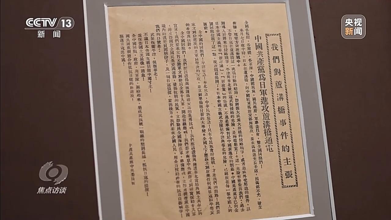 中国人民抗日战争纪念馆党委书记、馆长 罗存康:这说明中国共产党在民族危亡关头,肩负民族大义,代表中华民族的根本利益发出了抗战号召。在“九一九宣言”里面提出了,只有中国共产党的领导下才能驱逐日本帝国主义出中国。我们要发动游击战争。决心很大、意志非常坚定。