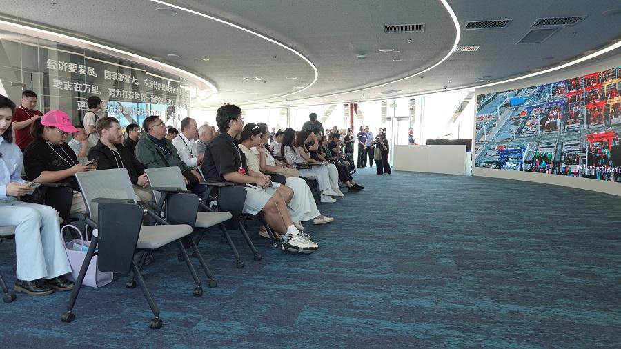 码头负责人向嘉宾介绍,天津港智慧零碳码头依托5G、人工智能和新能源技术,实现了全流程自动化作业,年吞吐量可达2329万标准箱。同时,通过风光储能一体化系统,码头运营实现100%绿色电力供应,碳排放接近于零。这一创新实践不仅提升了港口效率,也为全球港口绿色发展提供了“中国方案”。