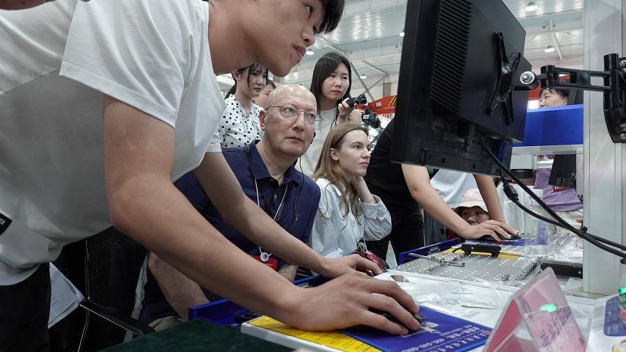 在鲁班工坊的实训基地,嘉宾们参观了智能制造、工业机器人等实训室。外国嘉宾还与中国学生同台操作激光打印机、机器人编程设备,体验了跨国合作的教学成果。
