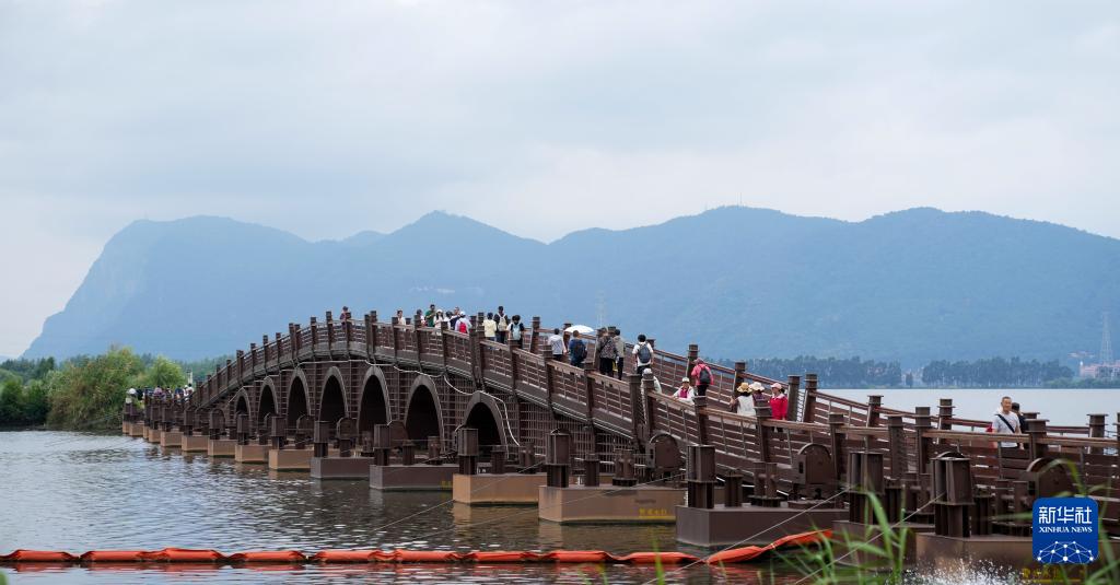 7月12日,游客在昆明市东风坝七孔浮桥游览参观。