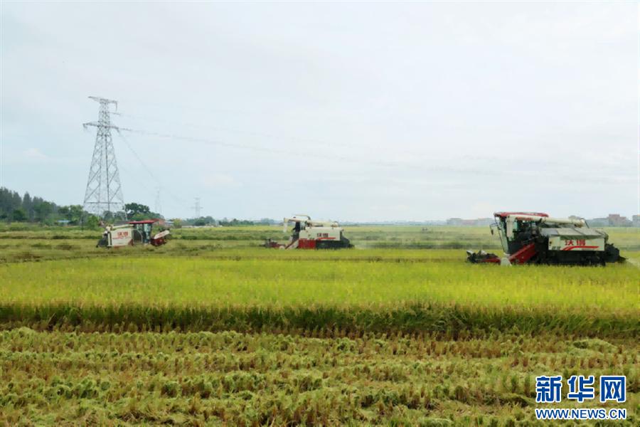 盛夏时节,广西东兴市千余亩早稻陆续进入成熟收割期。在福珍富硒水稻种植基地,金色的稻浪随风翻滚,收割机在田间来回穿梭,收割、脱粒、装车一气呵成,田间地头呈现繁忙的丰收景象。(甘立俊)