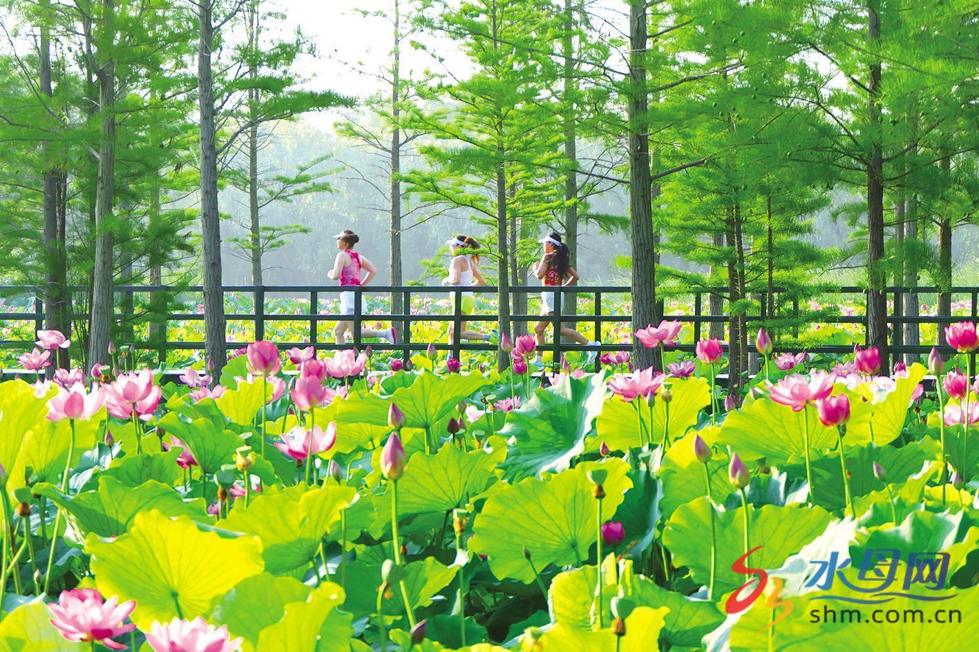夏日,在牟平区鱼鸟河湿地公园,万千荷花竞相绽放,摇曳生姿,市民们慢跑穿越荷塘,享受这独特的夏日清凉。