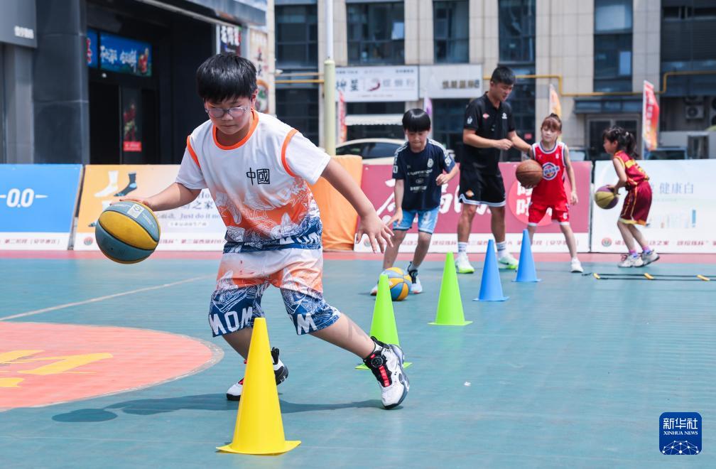 7月15日,在诸暨市悦朗新天地广场,篮球教练带领孩子们进行投篮、运球等基本训练。