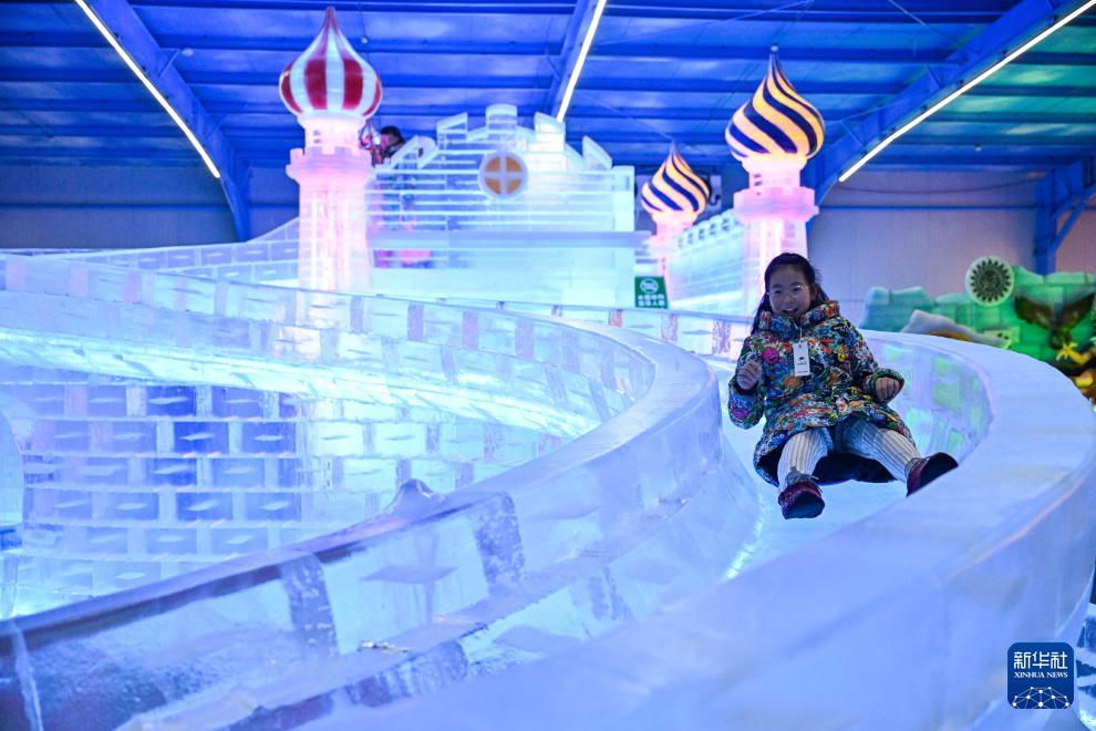 7月15日,小朋友在室内冰雪世界休闲娱乐。