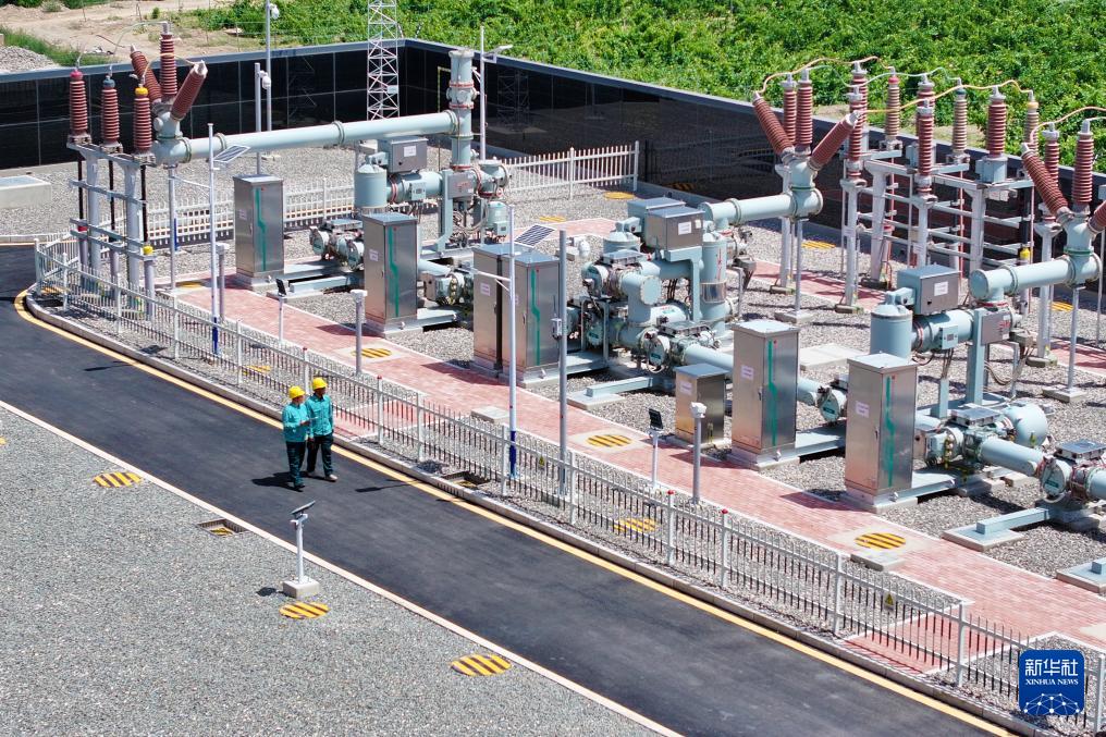 7月15日,国网银川供电公司变电运维中心员工在闽宁镇原隆110千伏变电站对设备进行巡检(无人机照片)。