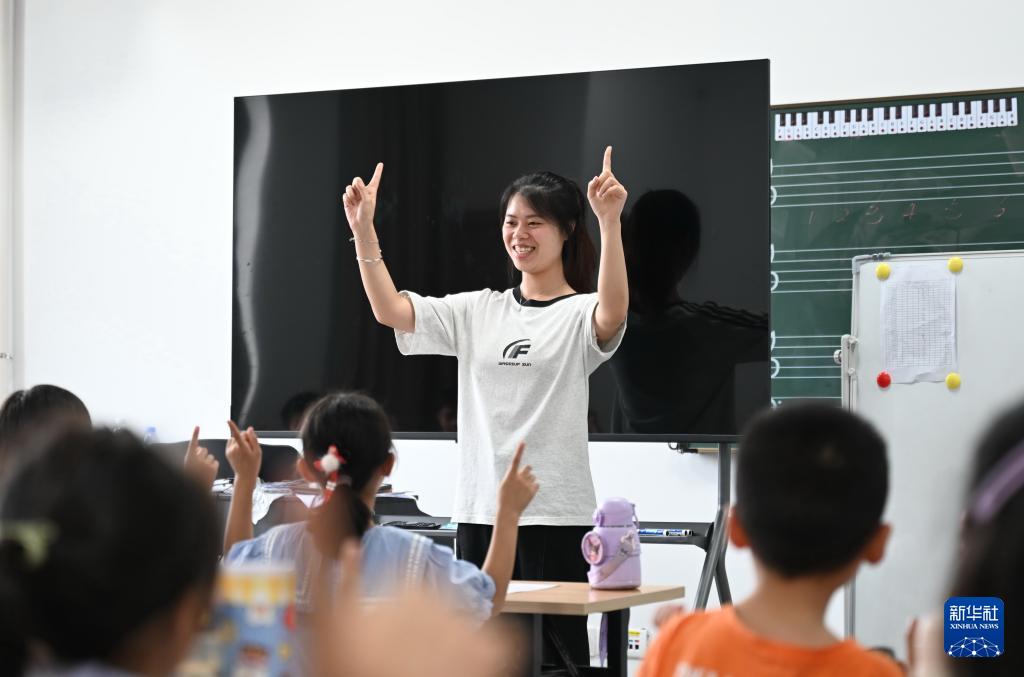 7月16日,返乡大学生志愿者周璐柯在公益暑托班上教孩子们音乐知识。