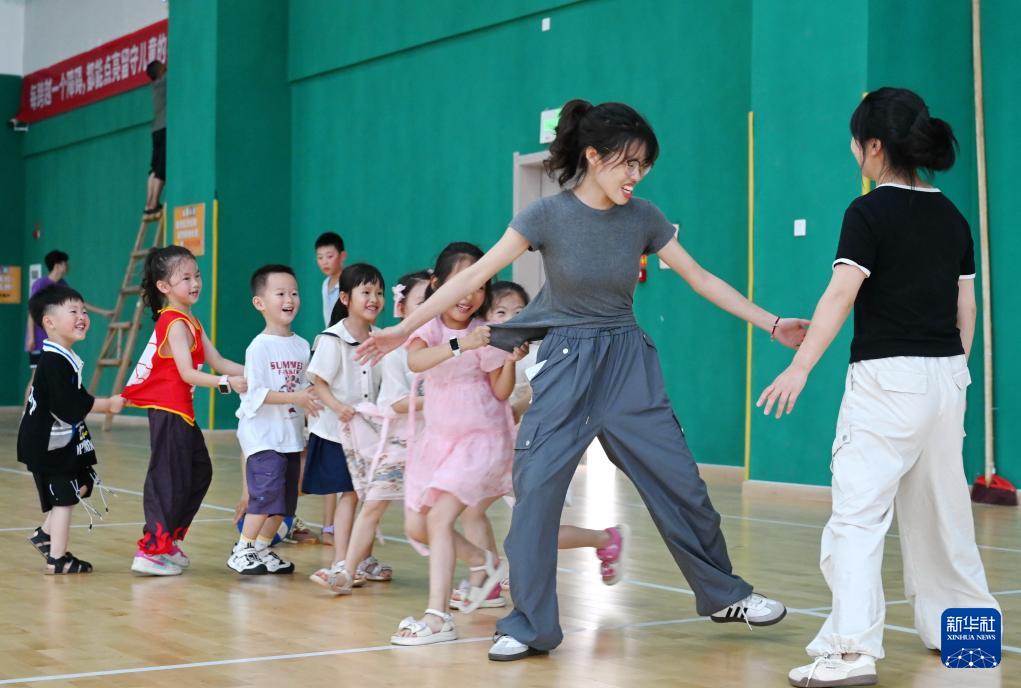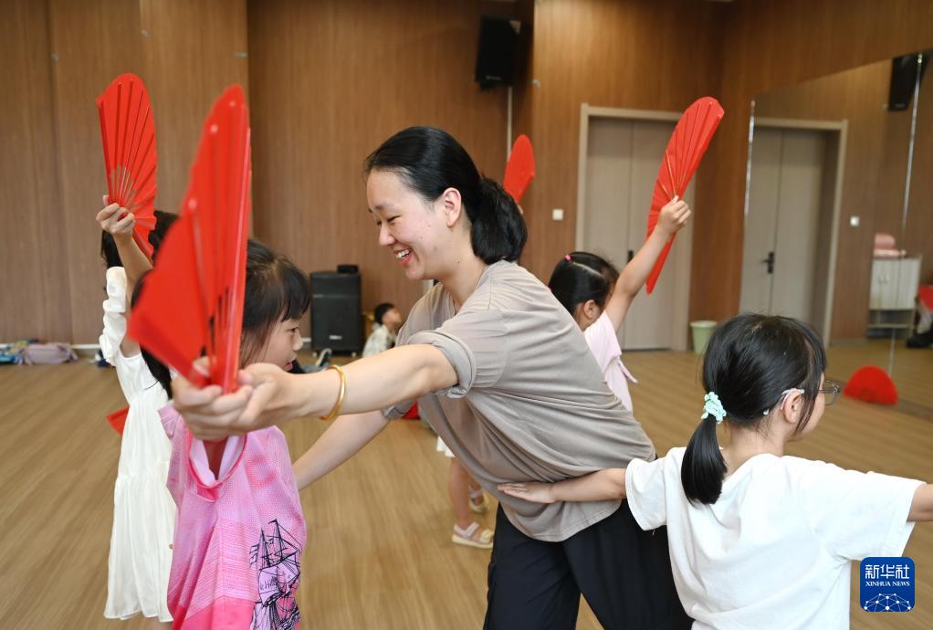 7月16日,志愿者周璐洋在公益暑托班上教孩子们舞蹈。
