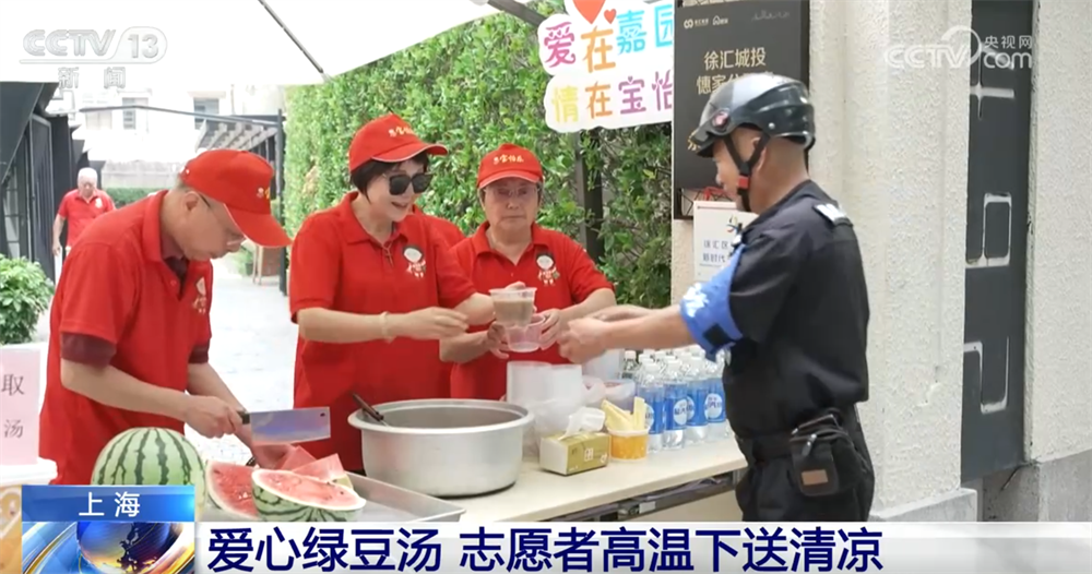 在上海,也有一群志愿者冒着高温,把一碗碗冰镇绿豆汤送到街头,让人们在炎炎夏日里品尝到清凉的味道。