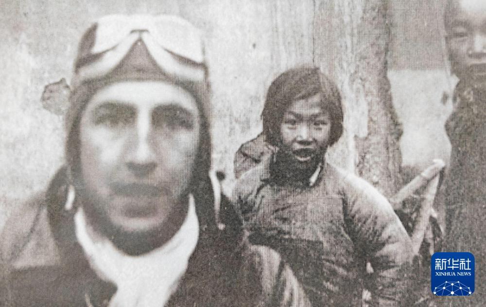 马西亚在父亲珍藏的相册中找到的两张泛黄照片:一张是上饶广丰10多个村民站在农房前的合影;另一张照片中,一个短发女童站在身着飞行夹克的美国飞行员身后,嘴巴张圆、眼神惊讶,十分惹人注目。